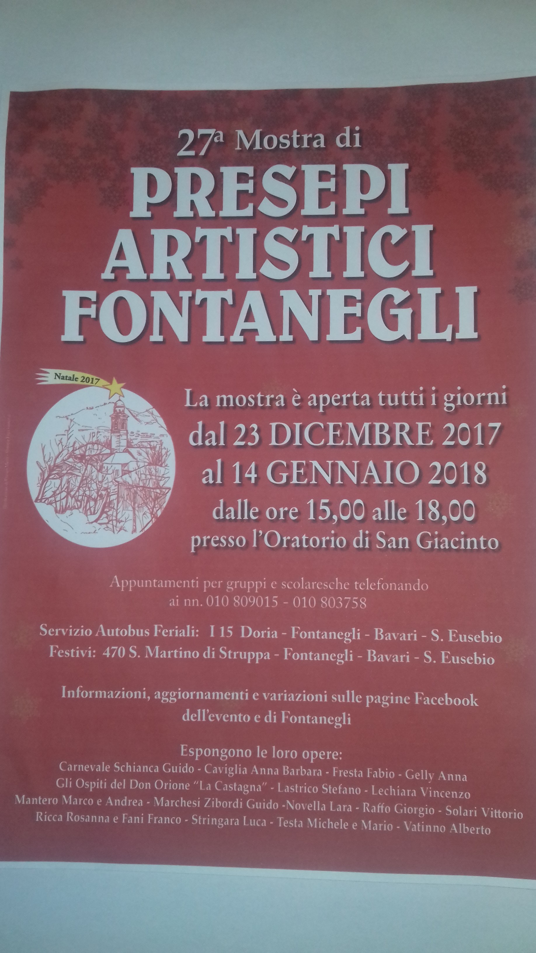 Si avvicinano a grandi passi le Festività Natalizie e ancora una volta la Confraternita di San Giacinto di Fontanegli, Località collinare sulla sinistra orografica del Bisagno, nota a tanti Genovesi per le trattorie dove si gustano tipici piatti locali e per la “Mangialunga” e le Sagre organizzate dalla U.S.F. 74, propone una nuova edizione della Mostra di Presepi.